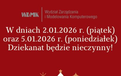 Szanowni Studenci Wydziału Zarządzania i Modelowania Komputerowego, uprzejmie informujemy, że w dniach 2.01.2026 r. (piątek) oraz 5.01.2026 r. (poniedziałek) Dziekanat będzie nieczynny!