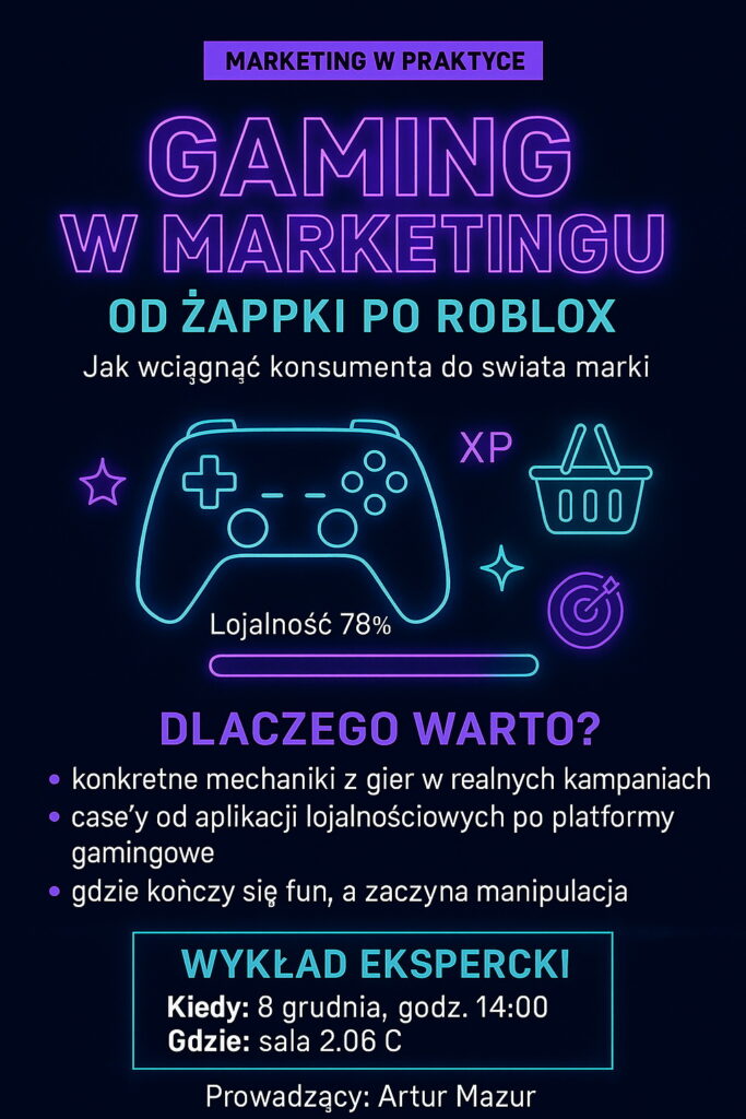 Zapraszamy na wyjątkowy wykład ekspercki „Gaming w marketingu – od Żappki po Roblox”! Dowiedz się, jak marki wykorzystują mechanizmy gier, aby przyciągnąć i zaangażować konsumentów. Spotkanie poprowadzi Artur Mazur i odbędzie się 8 grudnia o godzinie 14:00 w sali 2.06 C.