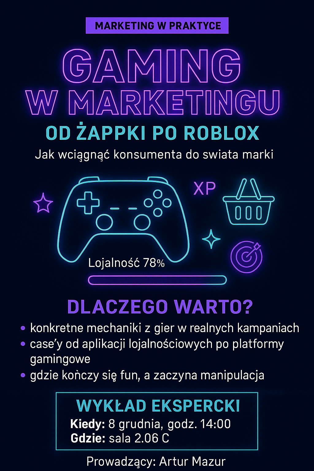 Zapraszamy na wyjątkowy wykład ekspercki „Gaming w marketingu – od Żappki po Roblox”! Dowiedz się, jak marki wykorzystują mechanizmy gier, aby przyciągnąć i zaangażować konsumentów. Spotkanie poprowadzi Artur Mazur i odbędzie się 8 grudnia o godzinie 14:00 w sali 2.06 C.